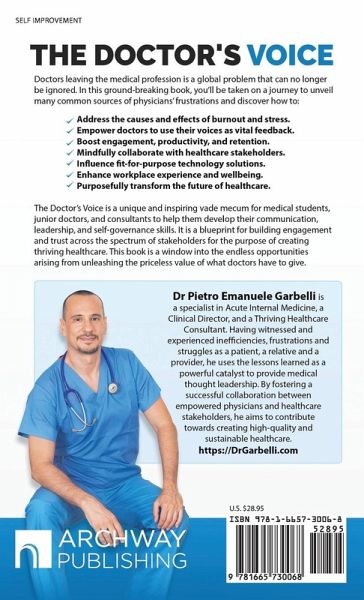 Discover the Secret to Eliminating Burnout, Improving Well-Being, and Building A Better Future For Healthcare! Do you feel exhausted, stuck and unfulfilled? You are not alone. In the wake of the COVID-19 pandemic, doctors leaving the medical profession has become a global problem that can no longer be ignored. In The Doctor's Voice, Dr. Pietro Emanuele Garbelli, a specialist in Acute Internal Medicine, clinical director and thriving healthcare consultant, explores common sources of frustration with practical steps that can help medical professionals reclaim their life and transform the healthcare field for the better. In This Ground-Breaking Book, You'll Discover: ¿ Essential Advice For Managing Burnout In an Overworked & Underfunded System ¿ Expert Communication Tips For Being Heard and Driving Change In Your Field ¿ Practical Steps To Boosting Engagement, Productivity and Retention ¿ How To Enhance Your Workplace Experience & Deliver the Best Possible Care To Your Patients ¿ How Fit-For-Purpose Technology Can Revolutionize Your Approach To Healthcare ¿ How To Rekindle Your Sense of Purpose & Start Feeling Like You're Making an Impact And More... A must-read for medical students, medical professionals, and healthcare providers seeking real and meaningful change, The Doctor's Voice is a window into unleashing the priceless value that doctors have to give. Praise for The Doctor's Voice: "Dr. Garbelli's excellent and original text is very timely, after a global pandemic, to give doctors the tools to cope with the daily frustrations of being a doctor and to rekindle their passion for medicine." - Dr. Sarah Frankton, FRCP, PhD, Chief Medical Officer, Consultant Physician "Dr. Garbelli is clear, concise, and reflective, demonstrating a deep understanding of self-development, communication, and emotional well-being, while offering practical solutions...an extremely engaging read from start to finish." "- James Wood, Deputy General Manager, Medicine "A must-read for every doctor and anyone interested in medicine, be it a medical stakeholder, a young person entertaining a career in medicine, or a service user. Thank you, Dr. Pietro, for writing this much-needed book and for sharing your wisdom for the benefit of us all." "- Dr. Anna Lukusa, General Practitioner