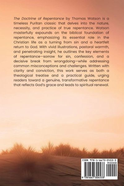 The Doctrine of Repentance by Thomas Watson is a timeless Puritan classic that delves into the nature, necessity, and practice of true repentance. Watson masterfully expounds on the biblical foundation of repentance, emphasizing its essential role in the Christian life as a turning from sin and a heartfelt return to God. With vivid illustrations, pastoral warmth, and penetrating insight, he outlines the key elements of repentance-sorrow for sin, confession, and a decisive break from wrongdoing-while addressing common misconceptions and challenges. Written with clarity and conviction, this work serves as both a theological treatise and a practical guide, urging readers toward a genuine, transformative repentance that reflects God's grace and leads to spiritual renewal.