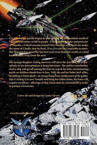 Corporatia has quietly begun to plot against the independent world of Vanadis and enslave or kill its people. It believes the founder and protector of Vanadis, a retired assassin named Ovin Shannen, who hired out under the name of Candle, may be dead. If so, it is safe for Corporatia to move. But Shannen has spent the last few years away from his world, as a bird leads a snake away from the nest. His teenage daughter Aisling, however, will move the stars and the corporations in her determination to bring him home. She and her twin brother steal a ship and go off among the stars to search for him, encountering perils no children should have to face. Still, she and her father have allies, including a charm quark—an energy being from another part of the galaxy. But if Aisling is to save Vanadis and bring her father home, the Fates will require sacrifices—offerings of that which must be surrendered in order to protect a loved one.