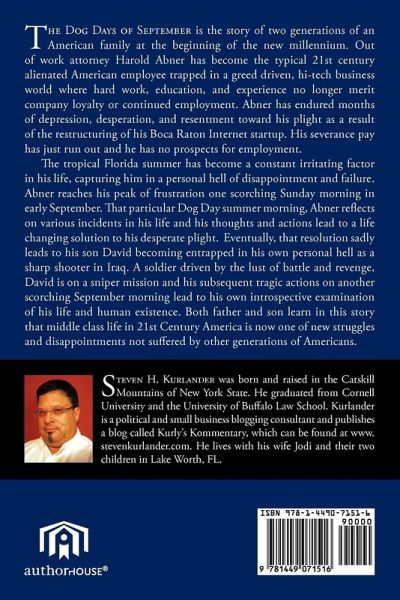 The Dog Days of September is the story of two generations of an American family at the beginning of the new millennium. Out of work attorney Harold Abner has become the typical 21st century alienated American employee trapped in a greed driven, hi-tech business world where hard work, education, and experience no longer merit company loyalty or continued employment. Abner has endured months of depression, desperation, and resentment toward his plight as a result of the restructuring of his Boca Raton Internet startup. His severance pay has just run out and he has no prospects for employment. The tropical Florida summer has become a constant irritating factor in his life, capturing him in a personal hell of disappointment and failure. Abner reaches his peak of frustration one scorching Sunday morning in early September. That particular Dog Day summer morning, Abner reflects on various incidents in his life and his thoughts and actions lead to a life changing solution to his desperate plight. Eventually, that resolution sadly leads to his son David becoming entrapped in his own personal hell as a sharp shooter in Iraq. A soldier driven by the lust of battle and revenge, David is on a sniper mission and his subsequent tragic actions on another scorching September morning lead to his own introspective examination of his life and human existence. Both father and son learn in this story that middle class life in 21st Century America is now one of new struggles and disappointments not suffered by other generations of Americans. Steven H. Kurlander was born and raised in the Catskill Mountains of New York State. He graduated from Cornell University and the University of Buffalo Law School. Kurlander is a political and small business blogging consultant and publishes a blog called Kurly's Kommentary, which can be found at www.stevenkurlander.com. He lives with his wife Jodi and their two children in Lake Worth, FL.