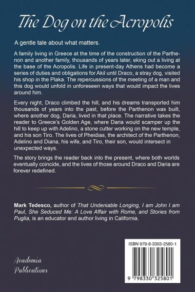 In ancient Greece, one family resided near the iconic structure during the construction of the Parthenon. Meanwhile, in present times, another family struggles to make a living at the foot of the Acropolis. The convergence of man and dog in these two distinct periods led to unforeseen and profound implications that resonated across generations. The narrative unfolds during Greece's Golden Age, taking the reader on a journey intertwined with the lives of remarkable characters. Daria, a spirited dog, would bound up the hill to accompany Adelino, a skilled stone cutter working on the grand temple, and his son Tiro. The tale intricately weaves together the lives of Pheidias, the ingenious architect of the Parthenon, Adelino and his wife Diana, and their son Tiro, resulting in unexpected intersections and remarkable connections. The story then transcends time, bringing us to the present day, where the past and present ultimately converge, profoundly transforming the fates of humans and canines.