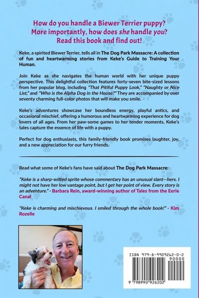 How do you handle a Biewer Terrier puppy? More importantly, how does she handle you? Read this book and find out! Keke, a spirited Biewer Terrier, tells all in The Dog Park Massacre: A collection of fun and heartwarming stories from Keke's Guide to Training Your Human .Join Keke as she navigates the human world with her unique puppy perspective. This delightful collection features forty-seven bite-sized lessons from her popular blog, including "That Pitiful Puppy Look," "Naughty or Nice List," and "Who is the Alpha Dog in the House?" They are accompanied by over seventy charming full-color photos that will make you smile. Keke's adventures showcase her boundless energy, playful antics, and occasional mischief, offering a humorous and heartwarming experience for dog lovers of all ages. From her paw-some games to her tender moments, Keke's tales capture the essence of life with a puppy. Perfect for dog enthusiasts, this family-friendly book promises laughter, joy, and a new appreciation for our furry friends. --- Read what some of Keke's fans have said about The Dog Park Massacre: "Keke is a sharp-witted sprite whose commentary has an unusual slant-hers. I might not have her low vantage point, but I get her point of view. Every story is an adventure." - Barbara Rein, award-winning author of Tales from the Eerie Canal "Keke is charming and mischievous. I smiled through the whole book!" - Kim Rozelle