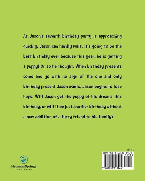 As Jason's seventh birthday party is approaching quickly, Jason can hardly wait. It's going to be the best birthday ever because this year, he is getting a puppy! Or so he thought. When birthday presents come and go with no sign of the one and only birthday present Jason wants, Jason begins to lose hope. Will Jason get the puppy of his dreams this birthday, or will it be just another birthday without a new addition of a furry friend to his family?