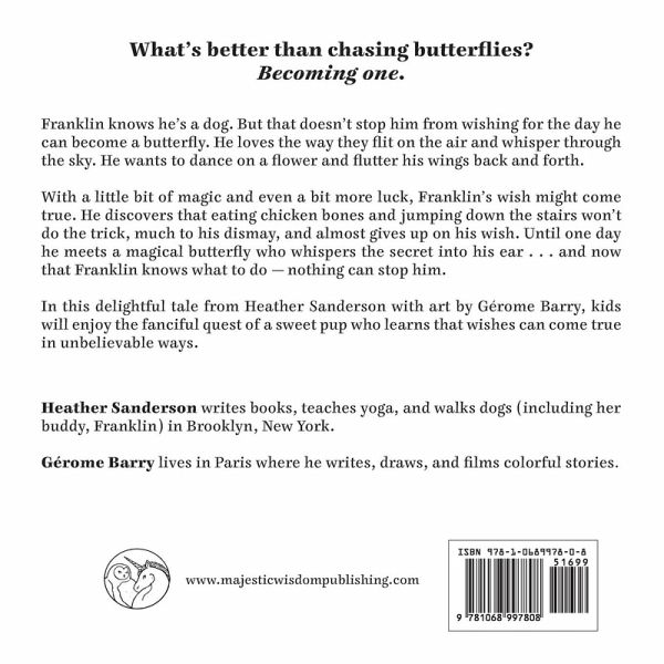 What's better than chasing butterflies? Becoming one. Franklin knows he's a dog. But that doesn't stop him from wishing for the day he can become a butterfly. He loves the way they flit on the air and whisper through the sky. He wants to dance on a flower and flutter his wings back and forth. With a little bit of magic and even a bit more luck, Franklin's wish might come true. He discovers that eating chicken bones and jumping down the stairs won't do the trick, much to his dismay, and almost gives up on his wish. Until one day he meets a magical butterfly who whispers the secret into his ear . . . and now that Franklin knows what to do-nothing can stop him. In this delightful tale from Heather Sanderson with art by Gérome Barry, kids will enjoy the fanciful quest of a sweet pup who learns that wishes can come true in unbelievable ways.