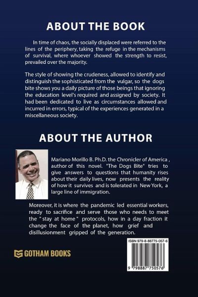 Mariano Morillo B. PhD. The Chronicler of America, Author of this novel. The Dogs Bite is the novel where the possessions and the possessors dance and shake their hands, while one and the other depend on a superior force that induces them to show the possibilities of being for the self-delight of the spirit. That is why the power of God teaches that there is no other greatness than His breath, because only the spirit defines the value of things. Without the rehearsal of life, and its assignments, the possessors would not be able to show the influences of their possessions. In the science of the spirit, and even to achieve results in the industry of religions, it has been necessary the elevation of the levels of consciousness that have been defined in the existential rehearsal, because the influences of the possessions merit the levels of consciousness, for the comprehension and valuation, because each one, shows the selection or assignment at their level of consciousness, that is why, when the pandemic diseases attack humanity, man in its survival, looks for a way to preserve itself above the possessions, because without the interaction of both versions of matter, everything remains in emptiness, however we can't forget that "everything that is seen, was made from what was not seen".