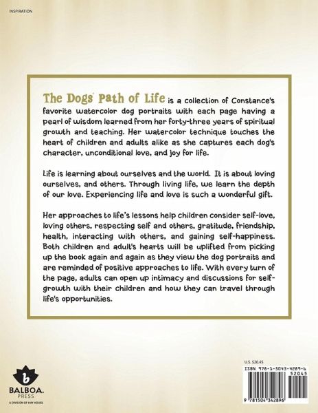 The Dogs' Path of Life is a collection of Constance's favorite watercolor dog portraits with each page having a pearl of wisdom learned from her forty-three years of spiritual growth and teaching. Her watercolor technique touches the heart of children and adults alike as she captures each dog's character, unconditional love, and joy for life. Life is learning about ourselves and the world. It is about loving ourselves, and others. Through living life, we learn the depth of our love. Experiencing life and love is such a wonderful gift. Her approaches to life's lessons help children consider self-love, loving others, respecting self and others, gratitude, friendship, health, interacting with others, and gaining self-happiness. Both children and adult's hearts will be uplifted from picking up the book again and again as they view the dog portraits and are reminded of positive approaches to life. With every turn of the page, adults can open up intimacy and discussions for self-growth with their children and how they can travel through life's opportunities.