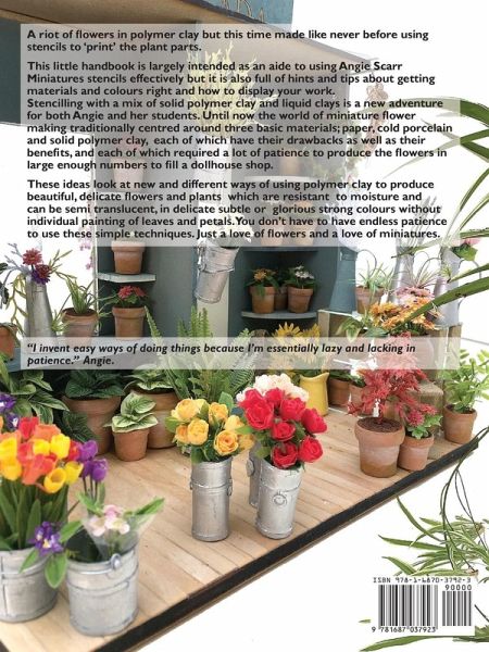 A riot of flowers in polymer clay but this time made like never before using stencils to ‘print’ the plant parts. This little handbook is largely intended as an aide to using Angie Scarr Miniatures stencils effectively but it is also full of hints and tips about getting materials and colours right and how to display your work. Stencilling with a mix of solid polymer clay and liquid clays (Goo) is a new adventure for both Angie and her students. Until now the world of miniature flower making traditionally centred around three basic materials; paper, cold porcelain and solid polymer clay, each of which have their drawbacks as well as their benefits, and each of which required a lot of patience to produce the flowers in large enough numbers to fill a dollhouse shop. These ideas look at new and different ways of using polymer clay to produce beautiful, delicate flowers and plants which are resistant to moisture and can be semi translucent, in delicate subtle or glorious strong colours without individual painting of leaves and petals. You don’t have to have endless patience to use these simple techniques. Just a love of flowers and a love of miniatures "I invent easy ways of doing things because I’m essentially lazy and lacking in patience." Angie.