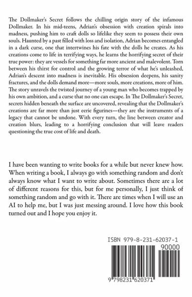 The Dollmaker's Secret follows the chilling origin story of the infamous Dollmaker. In his mid-teens, Adrian's obsession with creation spirals into madness, pushing him to craft dolls so lifelike they seem to possess their own souls. Haunted by a past filled with loss and isolation, Adrian becomes entangled in a dark curse, one that intertwines his fate with the dolls he creates. As his creations come to life in terrifying ways, he learns the horrifying secret of their true power: they are vessels for something far more ancient and malevolent. Torn between his thirst for control and the growing terror of what he's unleashed, Adrian's descent into madness is inevitable. His obsession deepens, his sanity fractures, and the dolls demand more-more souls, more creations, more of him. The story unravels the twisted journey of a young man who becomes trapped by his own ambition, and a curse that no one can escape. In The Dollmaker's Secret, secrets hidden beneath the surface are uncovered, revealing that the Dollmaker's creations are far more than just eerie figurines-they are the instruments of a legacy that cannot be undone. With every turn, the line between creator and creation blurs, leading to a horrifying conclusion that will leave readers questioning the true cost of life and death.