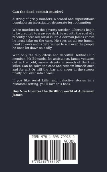 Can the dead commit murder? A string of grisly murders; a scared and superstitious populace; an investigator desperate for redemption When murders in the poverty-stricken Liberties begin to be credited to a savage dark beast with the soul of a recently deceased serial killer, Alderman James knows he must take on the case. He sees an all too human hand at work and is determined to win over the people he once let down so badly. With only the duplicitous and deceitful Hellfire Club member, Mr Edwards, for assistance, James ventures out in the cold, snowy streets in search of the true killer. Can he solve the case and redeem himself once and for all? Or will the fear and anger in the streets finally boil over into chaos? If you like serial killer and detective stories in a historical setting, you'll love this book. Buy Now to enter the thrilling world of Alderman James