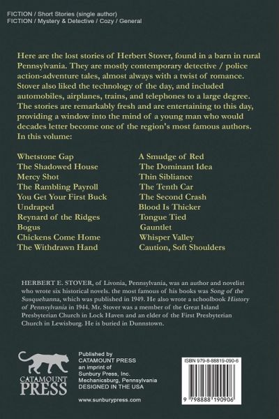 Herbert Stover was best known for his full-length historical novels full of action and historic figures, always with a twist of romance. However, before he sold his first novel to a New York publishing house after World War II, Stover struggled as an upstart writer of pulp fiction short stories, the vast majority of which were written in the 1920s and early 1930s. Rejection after rejection came back in the mail, and Stover, now in the Depression, turned his focus to his education career. The letters and stories were put away, largely forgotten. After Stover's death, his property exchanged hands. One day, in the early 2000s, the current owner was exploring the old barn on the property and found an old wooden bucket in the rafters. It contained pictures, letters, and typed stories that had been returned to Stover. But, the gentleman did nothing with these stories until the Fall of 2022, when author Guy Graybill and publisher Lawrence Knorr visited to take pictures of the former Stover homestead. The bucket was graciously given to Sunbury Press, and the adventure began! Debra Reynolds was handed the project of transcribing, editing, and patching the stories, where there were gaps due to the erosion of the paper. Silverfish had done their worst, but fortunately, preferred the pulp rather than the ink. Most of the stories were nearly complete. A couple required Debra's creativity to "become Herbert Stover" and fill the missing page or two. What follows is a volume of stories, lost for nearly 100 years! They are mostly contemporary detective / police action-adventure tales, almost always with a twist of romance. Stover also liked the technology of the day, and included automobiles, airplanes, trains, and telephones to a large degree. The stories are remarkably fresh and are entertaining to this day, providing a window into the mind of a young man who would decades letter become one of the region's most famous authors.