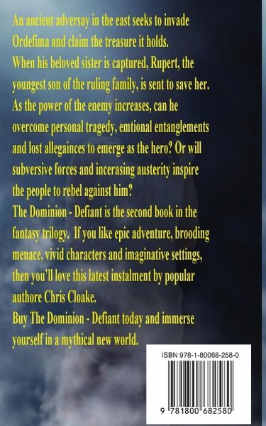 An ancient adversary in the east seeks to invade Ordefima and claim the treasures it holds. When his beloved sister is captured, Rupert, the youngest son of the ruling family, is sent to save her. As the power of the enemy increases, can he overcome personal tragedy, emotional entanglements and lost allegiances to emerge as the hero? Or will subversive forces and increasing austerity inspire the people to rebel against him? War with an ever threatening enemy seems unavoidable. The Dominion - Defiant is the second book in the fantasy trilogy. If you like epic adventure, dark brooding menace, vivid characters and imaginative settings, then you'll love this latest instalment by popular author Chris Cloake. Buy The Dominion - Defiant today and immerse yourself in a mythical new world.
