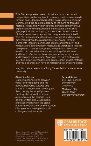 This Element presents new cultural, social, and economic perspectives on the eighteenth-century London masquerade through an in-depth analysis of the classic domino costume. Constructing the object biography of the domino through material, visual, and written sources will bring together various experiences of the masquerade and expand the existing geographical, chronological, and socio-economic scope of the entertainment beyond the masquerade event itself. This Element will examine the domino's physical and figurative movements from the masquerade warehouse, through eighteenth-century fashionable society, and into print and visual culture. It will draw upon masquerade warehouse records, newspapers, manuscripts, prints, and physical objects to establish a comprehensive understanding of the domino and how it reflected contemporary experiences of the real and imagined masquerade. Analysing the domino through interdisciplinary methodologies illustrates the impact material and visual sources can have on reshaping existing scholarship.
