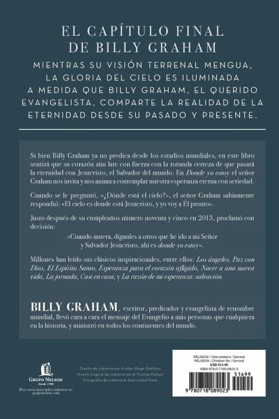 ¿¿Volver¿¿ y os llevar¿¿ conmigo para que tambi¿¿n est¿¿is donde yo estoy¿¿. Juan 14:3 El cap¿¿tulo final de Billy Graham. Experimenta la gloria del cielo mientras Billy Graham, el amado evangelista, comparte desde su pasado, y su presente, la realidad de la eternidad. Mientras nuestra naci¿¿n y el mundo se debaten en medio de incertidumbres pol¿¿ticas, econ¿¿micas y culturales, podemos encontrar consuelo en la esperanza que proviene de la verdad inmutable de la Palabra de Dios. Tanto si habla con un presidente de EE.UU., con un l¿¿der mundial o con el hombre com¿¿n, como si es entrevistado en una cadena de televisi¿¿n, Billy Graham siempre ha comenzado sus respuestas con ¿¿La Biblia dice...¿¿ En Donde yo estoy, el Sr. Graham comparte lo que la Biblia tiene que decir sobre la eternidad a partir de sus sesenta y seis libros; mensajes de verdad, advertencia, amor y certeza del futuro, todos ellos espigados por un hombre al que le gustar¿¿a ser recordado ¿¿nicamente como predicador del Evangelio de Jesucristo. La mayor promesa jam¿¿s dada a la raza humana sali¿¿ de los labios de nuestro Redentor cuando Jes¿¿s dijo: ¿¿No se turbe vuestro coraz¿¿n; si cre¿¿is en Dios, creed tambi¿¿n en m¿¿... Voy a prepararos un lugar... Volver¿¿ y os recibir¿¿ a m¿¿ mismo, para que donde yo est¿¿, est¿¿is tambi¿¿n vosotros¿¿ (Juan 14:1-3). Justo despü¿s de cumplir noventa y cinco ä¿os, el Sr. Graham proclam¿¿ con determinaci¿¿n: ¿¿Cuando muera, di a los dem¿¿s que me he ido con mi Se¿¿or y Salvador Jesucristo; all¿¿ es donde estoy¿¿. Where I am "I will come back and take you to be with me that you also may be where I am." John 14:3 The Final Chapter from Billy Graham. Experience the glory of heaven as Billy Graham, the beloved evangelist, shares from his past, and his present, the reality of eternity. As our nation and world travail in the midst of political, economic, and cultural uncertainties, we can find comfort in the hope that comes from the unchanging truth of God's Word. Whether talking with a US president, a world leader, or the common man or being interviewed on network television, Billy Graham has always begun his answers with "The Bible says..." In Where I Am, Mr. Graham shares what the Bible has to say about eternity from all of its sixty-six books; messages of truth, warning, love, and the certainty of the future, all gleaned by a man who would like to be remembered solely as a preacher of the Gospel of Jesus Christ. The greatest promise ever given to the human race came from the lips of our Redeemer when Jesus said, "Let not your heart be troubled; you believe in God, believe also in Me...I go to prepare a place for you...I will come again and receive you to Myself; that where I am, there you may be also" (John 14:1-3). Just after his ninety-fifth birthday, Mr. Graham proclaimed with resolve, "When I die, tell others that I've gone to my Lord and Savior Jesus Christ--that's where I am."