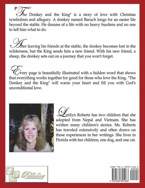 "The Donkey and the King" is a story of love with Christian symbolism and allegory. A donkey named Baruch longs for an easier life beyond the stable. He dreams of a life with no heavy burdens and no one to tell him what to do. After leaving the safety of the stable, the donkey becomes lost in the wilderness, but the King sends him a friend. With his new friend, a sheep, the donkey sets out on a journey that you won't forget. Every page is beautifully illustrated with a hidden word that shows everything works together for good for those who love the King. "The Donkey and the King" will warm your heart and fill you with God's unconditional love.