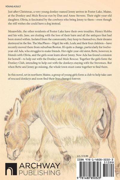 Just after Christmas, a very young donkey named Jenny arrives in Foster Lake, Maine, at the Donkey and Mule Rescue run by Dan and Anne Stevens. Their eight-year-old daughter, Olivia, is fascinated by the cowboys who bring Jenny to them—even though she still wishes she could have a dog instead. Meanwhile, the other residents of Foster Lake have their own troubles. Henry Hobbs and his wife, Jane, are dealing with the loss of their barn and all the antiques that had been stored within. Isolated from the community, they keep to themselves, their dreams destroyed in the fire. The MacPhees—Nigel; his wife, Leah; and their four children—have recently moved there from suburban Boston. It’s quite a change, particularly for twelve-year-old Ada, who struggles to make friends. Her eight-year-old sister, Bette, however, is friends with Olivia, and the girls soon learn about Jenny. Now Ada has found a mission for herself—to help out with the Donkey and Mule Rescue. Together the girls form the Donkey Club, intending to help out with the donkeys staying with the Stevenses. But when Bette and Jenny go missing, the whole town must come together to find them. In this novel, set in northern Maine, a group of young girls form a club to help take care of rescued donkeys and soon find their lives changed forever.