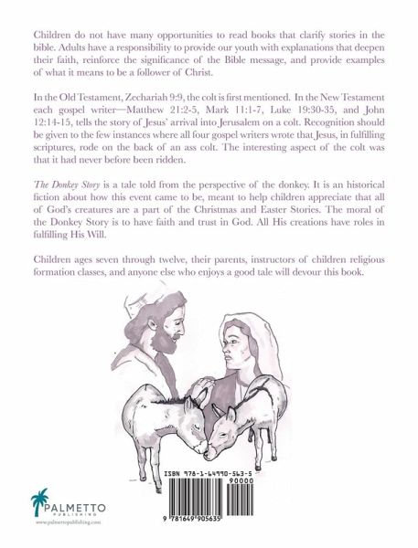 The colt is first mentioned in the Old Testament, Zechariah 9:9. In the New Testament, each gospel writer tells the story of Jesus' arrival into Jerusalem. All four wrote that Jesus, in fulfilling scriptures, rode on the back of an ass colt. The interesting aspect was that it had never before been ridden. Jesus arrived in Jerusalem riding on the back of an ass colt. The Donkey Story, told from the perspective of the donkey, is meant to help children have faith and trust in God, and appreciate that all of God's creatures are part of the Christmas and Easter stories. Children ages seven through twelve, their parents, instructors of religious classes, and anyone else who enjoys a good tale will devour this book.