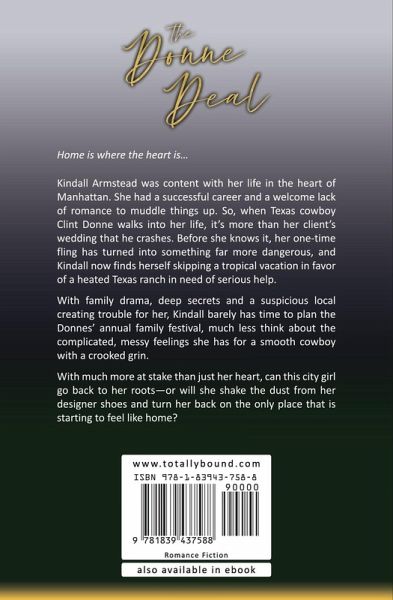 Home is where the heart is... Kindall Armstead was content with her life in the heart of Manhattan. She had a successful career and a welcome lack of romance to muddle things up. So, when Texas cowboy Clint Donne walks into her life, it's more than her client's wedding that he crashes. Before she knows it, her one-time fling has turned into something far more dangerous, and Kindall now finds herself skipping a tropical vacation in favor of a heated Texas ranch in need of serious help. With family drama, deep secrets and a suspicious local creating trouble for her, Kindall barely has time to plan the Donnes' annual family festival, much less think about the complicated, messy feelings she has for a smooth cowboy with a crooked grin. With much more at stake than just her heart, can this city girl go back to her roots-or will she shake the dust from her designer shoes and turn her back on the only place that is starting to feel like home?
