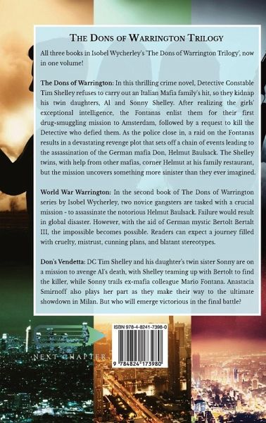 All three books in Isobel Wycherley's 'The Dons of Warrington Trilogy', now in one volume! The Dons of Warrington: In this thrilling crime novel, Detective Constable Tim Shelley refuses to carry out an Italian Mafia family's hit, so they kidnap his twin daughters, Al and Sonny Shelley. After realizing the girls' exceptional intelligence, the Fontanas enlist them for their first drug-smuggling mission to Amsterdam, followed by a request to kill the Detective who defied them. As the police close in, a raid on the Fontanas results in a devastating revenge plot that sets off a chain of events leading to the assassination of the German mafia Don, Helmut Baulsack. The Shelley twins, with help from other mafias, corner Helmut at his family restaurant, but the mission uncovers something more sinister than they ever imagined. World War Warrington: In the second book of The Dons of Warrington series by Isobel Wycherley, two novice gangsters are tasked with a crucial mission - to assassinate the notorious Helmut Baulsack. Failure would result in global disaster. However, with the aid of German mystic Bertolt Bertalt III, the impossible becomes possible. Readers can expect a journey filled with cruelty, mistrust, cunning plans, and blatant stereotypes. Don's Vendetta: DC Tim Shelley and his daughter's twin sister Sonny are on a mission to avenge Al's death, with Shelley teaming up with Bertolt to find the killer, while Sonny trails ex-mafia colleague Mario Fontana. Anastacia Smirnoff also plays her part as they make their way to the ultimate showdown in Milan. But who will emerge victorious in the final battle?