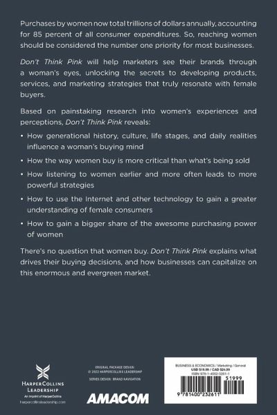 Purchases by women now total trillions of dollars annually, accounting for 85 percent of all consumer expenditures. So, reaching women should be considered the number one priority for most businesses. Don't Think Pink will help marketers see their brands through a woman's eyes, unlocking the secrets to developing products, services, and marketing strategies that truly resonate with female buyers. Based on painstaking research into women's experiences and perceptions, Don't Think Pink reveals: How generational history, culture, life stages, and daily realities influence a woman's buying mind How the way women buy is more critical than what's being sold How listening to women earlier and more often leads to more powerful strategies How to use the Internet and other technology to gain a greater understanding of female consumers How to gain a bigger share of the awesome purchasing power of women There's no question that women buy. Don't Think Pink explains what drives their buying decisions, and how businesses can capitalize on this enormous and evergreen market.