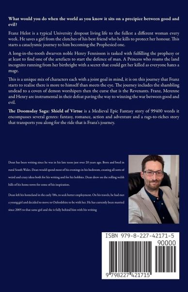 What would you do when the world as you know it sits on a precipice between good and evil? Franz Helot is a typical University dropout living life to the fullest a different woman every week. He saves a girl from the clutches of his best friend who he kills to protect her honour. This starts a cataclysmic journey to him becoming the Prophesied one. A long-in-the-tooth dwarven noble Henry Fennisson is tasked with fulfilling the prophesy or at least to find one of the artefacts to start the defence of man. A Princess who roams the land incognito running from her birthright with a secret that could get her killed as everyone hates a mage. This is a unique mix of characters each with a joint goal in mind, it is on this journey that Franz starts to realise there is more to himself than meets the eye. The journey includes the shambling undead to a coven of demon worshipers then the curse that is the Revenants. Franz, Merenne and Henry are instrumental in their defeat paving the way to winning the war between good and evil. The Doomsday Saga: Shield of Virtue is a Medieval Epic Fantasy story of 99400 words it encompasses several genres: fantasy, romance, action and adventure and a rags-to-riches story that transports you along for the ride that is Franz's journey.