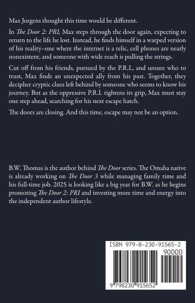 Max Jorgens thought this time would be different. He was right, but he also got more than he expected. In The Door 2: PRI, Max steps through the door again, expecting to return to the life he lost. Instead, he finds himself in a warped version of his reality-one where the internet is a relic, cell phones are nearly nonexistent and someone with wide reach is pulling the strings. Cut off from his friends, pursued by the P.R.I., and unsure who to trust, Max finds an unexpected ally from his past. Together, they decipher cryptic clues left behind by someone who seems to know his journey. But as the oppressive P.R.I. tightens its grip, Max must stay one step ahead, searching for his next escape hatch. The doors are closing. And this time, escape may not be an option.