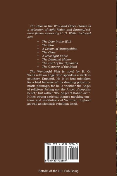 The Door in the Wall and Other Stories is a collection of eight fiction and fantasy/science fiction stories by H. G. Wells. Included are: The Door in the Wall, The Star, A Dream of Armageddon, The Cone, A Moonlight Fable, The Diamond Maker, The Lord of the Dynamos, The Country of the Blind. The Wonderful Visit is novel by H. G. Wells with an angel who spends a a week in southern England. He is at first mistaken for a bird because of his dazzling polychromatic plumage, for he is "neither the Angel of religious feeling nor the Angel of popular belief," but rather "the Angel of Italian art.". It has strong satirical themes mocking customs and institutions of Victorian England as well as idealistic rebellion itself.