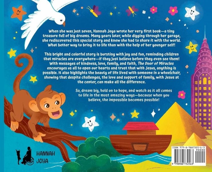 When she was just seven, Hannah Joya wrote her very first book-a tiny treasure full of big dreams. Many years later, while digging through her garage, she rediscovered this special story and knew she had to share it with the world. What better way to bring it to life than with the help of her younger self! This bright and colorful story is bursting with joy and fun, reminding children that miracles are everywhere-if they just believe before they even see them! With messages of kindness, love, family, and faith, The Door of Miracles encourages us all to open our hearts and trust that with Jesus, anything is possible. It also highlights the beauty of life lived with someone in a wheelchair, showing that despite challenges, the love and support of family, with Jesus at the center, can make all the difference. So, dream big, hold on to hope, and watch as it all comes to life in the most amazing ways-because when you believe, the impossible becomes possible!