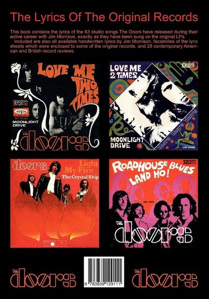 This book contains the lyrics of the 63 studio songs The Doors have released during their active career with Jim Morrison, exactly as they have been sung on the original LPs.Included are also all available handwritten lyrics by Jim Morrison, facsimiles of the lyric sheets which were enclosed to some of the original records, and 28 contemporary American and British record reviews.Limited Edition. 124 pages. Illustrated with 9 color and 27 black and white illustrations.