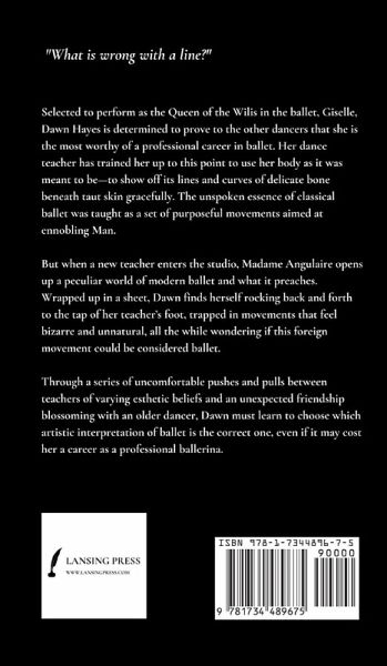 Selected to perform as the Queen of the Wilis in the ballet, Giselle, Dawn Hayes is determined to prove to the other dancers that she is the most worthy of a professional career in ballet. Her dance teacher has trained her up to this point to use her body as it was meant to be-to show off its lines and curves of delicate bone beneath taut skin gracefully. The unspoken essence of classical ballet was taught as a set of purposeful movements aimed at ennobling Man. But when a new teacher enters the studio, Madame Angulaire opens up a peculiar world of modern ballet and what it preaches. Wrapped up in a sheet, Dawn finds herself rocking back and forth to the tap of her teacher's foot, trapped in movements that feel bizarre and unnatural, all the while wondering if this foreign movement could be considered ballet. Through a series of uncomfortable pushes and pulls between teachers of varying esthetic beliefs and an unexpected friendship blossoming with an older dancer, Dawn must learn to choose which artistic interpretation of ballet is the correct one, even if it may cost her a career as a professional ballerina.