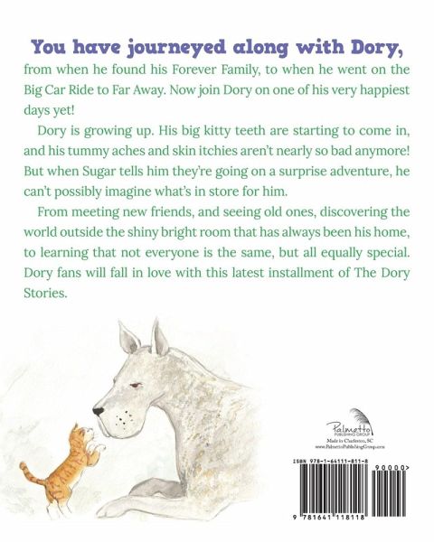 You have journeyed along with Dory, from when he found his Forever Family, to when he went on the Big Car Ride to Far Away. Now join Dory on one of his very happiest days yet! Dory is growing up. His big kitty teeth are starting to come in, and his tummy aches and skin itchies aren't nearly so bad anymore! But when Sugar tells him they're going on a surprise adventure, he can't possibly imagine what's in store for him. From meeting new friends, and seeing old ones, discovering the world outside the shiny bright room that has always been his home, to learning that not everyone is the same, but all equally special. Dory fans will fall in love with this latest episode of The Dory Stories.