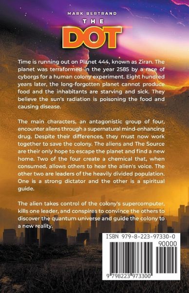 In the depths of a forgotten planet, Ziran, a dying colony teeters on the edge of oblivion. Radiation poisoning ravages their bodies, while society crumbles beneath the weight of despair. In their darkest hour, they turn to an ancient ritual, birthing a child with otherworldly powers. Zosimos, the chosen one, grows at an unnatural pace, his mind ablaze with extraordinary abilities. But an encounter with a mysterious plant unleashes a tempest of anger within him, and instead of becoming a savior, he transforms into something they never expected. Amidst the chaos, a glimmer of hope emerges. Vallena, with her life-saving discovery, and Kelv, a sage bound to the path of nonviolence, become the last chance to salvage a future from the ashes. Can they unlock the secrets to healing the poisoned land and quell Zosimos's wrath before it consumes them all? Will the colony find salvation, or will they succumb to the haunting forces that threaten their very existence? Find out more in "The Dot" - a page turning work of futuristic science fiction rife with mystery, fantasy adventure, alien technology, cybernetic beings, humanoid races, and profound philosophical underpinnings that will linger in your thoughts well beyond the final page. "The Dot" is an enigmatic tale of survival, power, and the fragile threads that hold humanity together. Mark Bertrand, in this dystopian novel, weaves a mesmerizing narrative, where darkness and redemption collide in a race against time. As you delve into the pages of this gripping and thought-provoking work of post-apocalyptic fiction, be prepared to encounter a myriad of captivating elements that will keep you on the edge of your seat. But this thriller book offers more than just pulse-pounding action and intricate world-building. Prepare to explore existential questions and contemplate the nature of humanity as you navigate the intricacies of the narrative! Within this top technothriller, immerse yourself in a world where the line between A.I. artificial intelligence and humanity blurs, where ancient mysteries intertwine with modern advancements, and where the power of imagination knows no bounds. A captivating addition to the library of science fiction enthusiasts, geeks, and those who crave visionary literature. This enthralling mystery book combines space opera, advanced technology, alternate history, future wars, and metaphysical spirituality, making it a perfect gift for readers who enjoy immersive imaginative worlds. With its seamless integration of alien invasions, cyborgs, and thought-provoking theology, this stellar piece of hard science fiction offers a unique reading experience that satisfies both die-hard sci-fi fans and those seeking compelling narratives. Spark your imagination and leave a lasting impression on your friends with "The Dot" – Get your Copy Today!