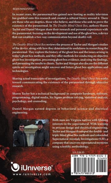 In recent years, the paranormal has gained new footing as reality television has grabbed onto this research and created a cultural frenzy around it. There are those who are skeptics, those who believe, and those who seek to prove the existence of the paranormal. In The Double-Blind Ghost Box, authors Shawn Taylor and Daniel Morgan share their research and personal experiences with the paranormal, focusing on the development and use of the ghost box, a device that can establish a two-way communication beyond death's veil. The Double-Blind Ghost Box reviews the process of Taylor and Morgan's studies of the device, along with how they determined its usefulness in researching the paranormal. They explore the history of the ghost box and the issues arising in today's ghost box methods, and they offer methods for conducting an objective ghost box investigation, processing ghost box evidence, analyzing the findings, and presenting the results to clients. Taylor and Morgan also discuss the different spirits an investigation might uncover and future ghost box applications and technologies. Sharing actual transcripts of investigations, The Double-Blind Ghost Box works toward communicating the existence of the paranormal through objective research. Shawn Taylor has a technical background in computer hardware, software, programming, digital media, Six Sigma problem solving, statistical analysis, psychology, and counseling. Daniel Morgan earned degrees in behavioral science and electrical engineering.