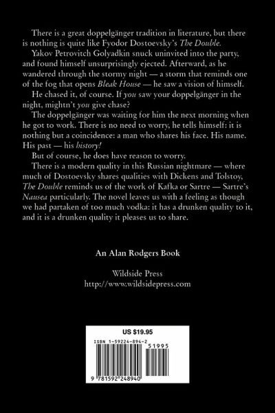 There is a great doppelganger tradition in literature, but there is nothing is quite like Fyodor Dostoevsky's _The Double_. There is a modern quality in this Russian nightmare -- where much of Dostoevsky shares qualities with Dickens and Tolstoy, The Double reminds us of the work of Kafka or Sartre -- Sartre's 'Nausea' particularly. The novel leaves us with a feeling as though we had partaken of too much vodka: it has a drunken quality to it, and it is a drunken quality it pleases us to share.
