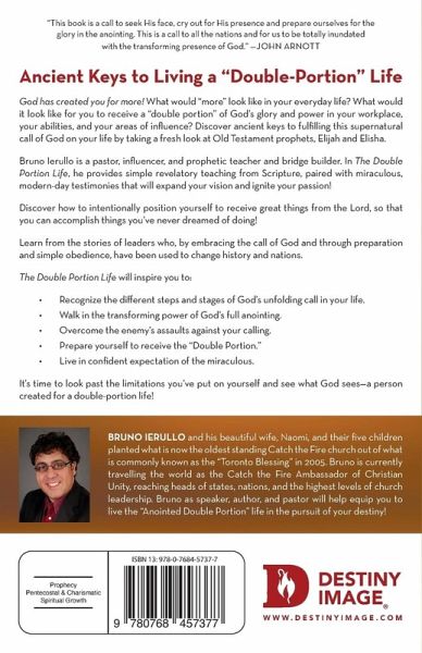 "This book is a call to seek His face, cry out for His presence and prepare ourselves for the glory in the anointing. This is a call to all the nations and for us to be totally inundated with the transforming presence of God." - John Arnott Ancient Keys to Living a "Double-Portion" Life God has created you for more! What would "more" look like in your everyday life? What would it look like for you to receive a "double portion" of God's glory and power in your workplace, your abilities, and your areas of influence? Discover ancient keys to fulfilling this supernatural call of God on your life by taking a fresh look at Old Testament prophets, Elijah and Elisha. Bruno Ierullo is a pastor, influencer, and prophetic teacher and bridge builder. In The Double Portion Life, he provides simple revelatory teaching from Scripture, paired with miraculous, modern-day testimonies that will expand your vision and ignite your passion! Discover how to intentionally position yourself to receive great things from the Lord, so that you can accomplish things you've never dreamed of doing! Learn from the stories of leaders who, by embracing the call of God and through preparation and simple obedience, have been used to change history and nations. The Double Portion Life will inspire you to: Recognize the different steps and stages of God's unfolding call in your life. Walk in the transforming power of God's full anointing. Overcome the enemy's assaults against your calling. Prepare yourself to receive the "Double Portion". Live in confident expectation of the miraculous. It's time to look past the limitations you've put on yourself and see what God sees - a person created for a double-portion life!