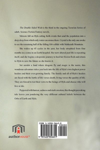 The Double Sided Wish is the third in the ongoing Tazarian Series of adult, Science Fiction Fantasy novels. Meteors fall on Hyla setting forth events that send the population into a deep sleep from which only water can arouse them. Crystal is the only one awake to see the remaining half of the falling Orb collide with Matherath Mountain. She wakes up 45 cycles in the past, her body atrophied from four months in a coma in an Earth hospital. Her now altered past life is repeating itself, and she begins a desperate journey to heal her frozen flesh and return to Hyla to save the future as she knows it. Set amidst a land where dragons fly and magic is the norm, this wondrous adventure takes you back into the life of Hyla's two highest power healers and their ever-growing family. The family and all of Hyla's healers are faced with the battle of life verses death; living verses the quality of life. They are forced to test their vows to the beings of Hyla and choose who will live or die. Peppered with humor, sadness and stark emotion, this thought provoking tale leaves you pondering the very different cultural beliefs between the Orbs of Earth and Hyla.