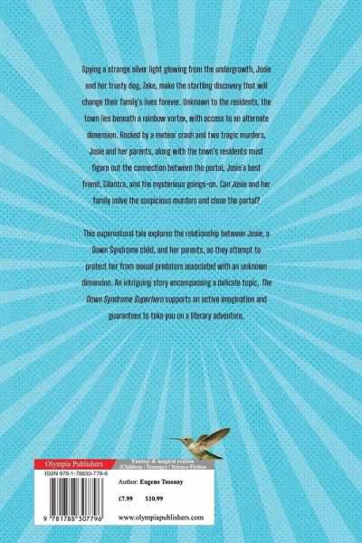 Spying a strange silver light glowing from the undergrowth, Josie and her trusty dog, Zeke, make the startling discovery that will change their family's lives forever. Unknown to the residents, the town lies beneath a rainbow vortex, with access to an alternate dimension. Rocked by a meteor crash and two tragic murders, Josie and her parents, along with the town's residents must figure out the connection between the portal, Josie's best friend, Cilantra, and the mysterious goings-on. Can Josie and her family solve the suspicious murders and close the portal?This supernatural tale explores the relationship between Josie, a Down Syndrome child, and her parents, as they attempt to protect her from sexual predators associated with an unknown dimension. An intriguing story encompassing a delicate topic, The Down Syndrome Superhero supports an active imagination and guarantees to take you on a literary adventure.
