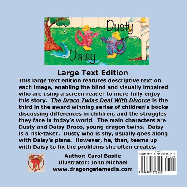 The Draco Twins Deal with Divorce Large Text Edition features descriptive text on images enabling those using a screen reader to more fully enjoy this story. This is a children's book discussing differences in children and many of the struggles children face in today's world. The main characters are Dusty and Daisy Draco, young dragon twins. Other characters in this book include a school friend Sarah. Daisy is an adventurous risk taker and Dusty is more careful and thoughtful. Daisy loves new and different things and places to explore. She's quick to act, many times without thinking first. Dusty usually goes along with Daisy's adventures. However, he then helps Daisy to resolve the problems she often unwittingly creates. In The Draco Twins Deal with Divorce, the Draco Twins while splashing in the puddles after a rainstorm, meet their classmate, Sarah. Sarah looks sad and can't play with them because she has chores to finish. Dusty and Daisy decide to help Sarah with her chores instead of playing in the puddles. In this third book of the series, Daisy, of course, causes a problem and Dusty saves the day. The twins learn that Sarah's parents are divorced. Talking with Sarah, the twins help Sarah find hope in knowing how much her parents love her.