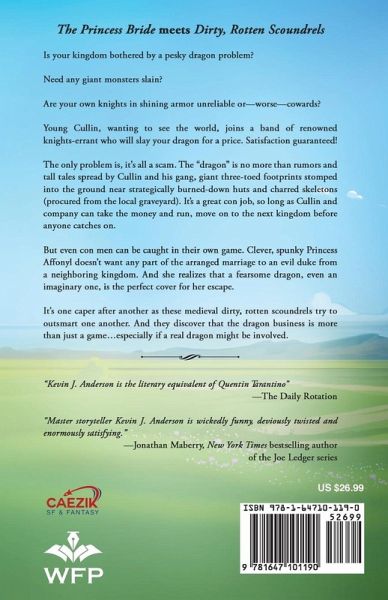 Is your kingdom bothered by a pesky dragon problem? Need any giant monsters slain? Are your own knights in shining armor unreliable or-worse--cowards? Young Cullin, wanting to see the world, joins a band of renowned knights errant who will slay your dragon for a price. Satisfaction guaranteed! The only problem is, it's all a scam. The "dragon" is no more than rumors and tall tales spread by Cullin and his gang, giant three-toed footprints stomped into the ground near strategically burned-down huts and charred skeletons (procured from the local graveyard). It's a great con job, so long as Cullin and company can take the money and run, move on to the next kingdom before anyone catches on. But even con men can be caught in their own game. Clever, spunky Princess Affonyl doesn't want any part of the arranged marriage to an evil duke from a neighboring kingdom. And she realizes that a fearsome dragon, even an imaginary one, is the perfect cover for her escape. It's one caper after another as these medieval dirty, rotten scoundrels try to outsmart one another. And they discover that the dragon business is more than just a game...especially if a real dragon might be involved.