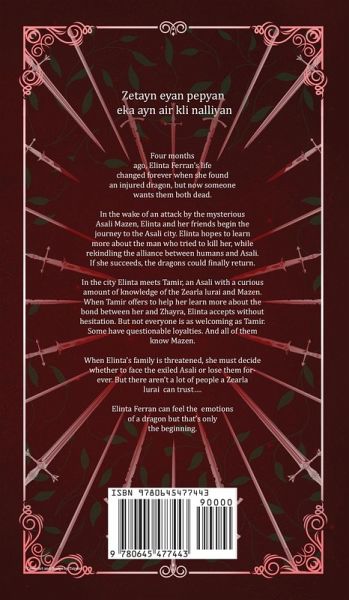 Zetayn eyan pepyan eka ayn air kli nalliyan Four months ago, Elinta Ferran's life changed forever when she found an injured dragon, but now someone wants them both dead. In the wake of an attack by the mysterious Asali Mazen, Elinta and her friends begin the journey to the Asali city. Elinta hopes to learn more about the man who tried to kill her while rekindling the alliance between humans and Asali. If she succeeds, the dragons could finally return. In the city Elinta meets Tamir, an Asali with a curious amount of knowledge of the Zearla lurai and Mazen. When Tamir offers to help her learn more about the bond between her and Zhayra, Elinta accepts without hesitation. But not everyone is as welcoming as Tamir. Some have questionable loyalties. And all of them know Mazen. When Elinta's family is threatened, she must decide whether to face the exiled Asali or lose them forever. But there aren't a lot of people a Zearla lurai can trust.... Elinta Ferran can feel the emotions of a dragon but that's only the beginning.