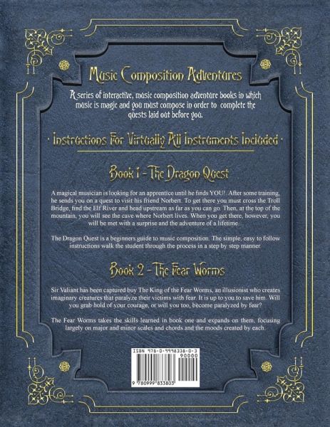 You are about to go on an adventure in a land where music is magic and you must compose to complete the quests that are laid out before you. The Dragon Quest is a delightful introduction to music composition. A magical musician is looking for an apprentice until he finds you. If you are willing, he will send you on an adventure that will require you to compose music of your own to overcome challenges and complete your mission. The Dragon Quest contains several easy music composition exercises that will give students a solid introduction to the magical world of music composition. In addition to teaching composition, the story in this book explores concepts such as musicianship, courage, perspective taking and smart practice. Through the use of stories, students engage with these ideas and take ownership of these concepts. No matter what your instrument or your age, The Dragon Quest is sure to become one of your favorite music instruction books of all time. What instruments can use Music Composition Adventures? There are specific instructions for 19 of the most common instruments: Piano, Recorder, Guitar, Flute, Oboe, Clarinet, Saxophone, Bassoon, French Horn, Trumpet, Trombone, Baritone, Euphonium, Tuba, Pitched Percussion (Marimba, xylophone, etc.), Violin, Viola, Cello and Bass. Unless you play in a gamelan ensemble or you play some other obscure, non-western, musical instruments, if your instrument is not on this list, you should have no trouble following the instructions for another instrument. Why should students compose? Composing music is a creative form of self expression that is fun and rewarding. Composers take ownership of their own musical creativity. Suddenly, music has a whole new component, one in which they are the creators. Composing music helps with ear training (being able to play what one hears). An understanding of the composition process helps students understand the works of other composers. When students compose, they make decisions about their musical preferences. Composing music helps develop musical memory. Why should students write music on a page? The process of writing music on a page is an excellent way to deepen a students understanding of music notation. Putting pencil to paper creates a connection to the details of music notation and their function. It gives real world experience with elements of music that are often only conceptualized or worse, overlooked. What age is Music Composition Adventures intended for? Ages 6 and up What does the student need to know before they can begin The Dragon Quest? The Dragon Quest is designed to be an easy introduction to writing music. Students don't need a lot of experience with music notation but it is recommended that they have had a preliminary introduction to music notation. This can be given by a general music educator at school, a private lessons teacher or even a parent who has some basic knowledge of music notation. Will there be a book two? Yes! Be on the look out for Book 2 - The Fear Worms, available soon! For creative teaching ideas please visit www.MusicCompositionAdventures.com keywords: music composition, composing, songwriting, how to compose, how to write a song, make your own music, kids, children, for kids, for children, music education, study music, book, story, kids, elfs, elves, trolls, dragons, music notes, teaching music through composition, MUS007000, MUS038000, MUS022000, MUS016000, JUV031040, JUV037000, JUV002270, JUV02000,