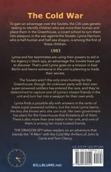 The Cold War To gain an advantage over the Soviets, the CIA uses genetic testing to identify children who are more than human and place them in the Greenhouse, a covert school to turn them into weapons in the war against the Soviets. Lynna Harrison, who is half-human and half-sea dragon, is among the first of these children. 1983 Lynna and her teammates are using their powers to aid in the Agency's black ops, an advantage the Soviets have yet to discover. That's until Lynna goes on a mission in East Berlin and learns someone in the unit is planning to trade their secrets. The Soviets aren't the only ones hunting for the Greenhouse, though. An unknown party with their own super-powered soldiers has entered the race, and they're determined to capture one of Lynna's closest friends in the unit and turn her into a weapon for their own ends. Lynna finds a possible ally with answers in the ranks of these super-powered soldiers, but the more Lynna learns, the less she knows who she can trust. Her own government has plans for the Greenhouse that threatens all of them. There's also more than one traitor in her unit, and one of them is among her most trusted friends. THE DRAGON SPY takes readers on an adventure that blends the "X-Men" with the Cold War thrillers of John le Carré and Tom Clancy.