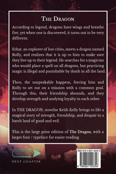 According to legend, dragons have wings and breathe fire, yet when one is discovered, it turns out to be very different. Ethar, an explorer of lost cities, meets a dragon named Rolly, and realizes that it is up to him to make sure they live up to their legend. He searches for a magician who would place a spell on all dragons, but practicing magic is illegal and punishable by death in all the land. Then, the unspeakable happens, forcing him and Rolly to set out on a mission with a common goal. Through this, their friendship abounds, and they develop strength and undying loyalty to each other. In THE DRAGON, novelist Keith Kelly brings to life a magical story of strength, friendship, and despair in a harsh land of good and evil. This is the large print edition of The Dragon, with a larger font / typeface for easier reading.