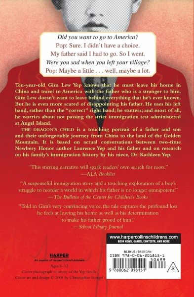 Did you want to go to America? Pop: Sure. I didn't have a choice. My father said I had to go. So I went. Were you sad when you left your village? Pop: Maybe a little . . . well, maybe a lot. Ten-year-old Gim Lew Yep knows that he must leave his home in China and travel to America with the father who is a stranger to him. Gim Lew doesn't want to leave behind everything that he's ever known. But he is even more scared of disappointing his father. He uses his left hand, rather than the "correct" right hand; he stutters; and most of all, he worries about not passing the strict immigration test administered at Angel Island. The Dragon's Child is a touching portrait of a father and son and their unforgettable journey from China to the land of the Golden Mountain. It is based on actual conversations between two-time Newbery Honor author Laurence Yep and his father and on research on his family's immigration history by his niece, Dr. Kathleen Yep.