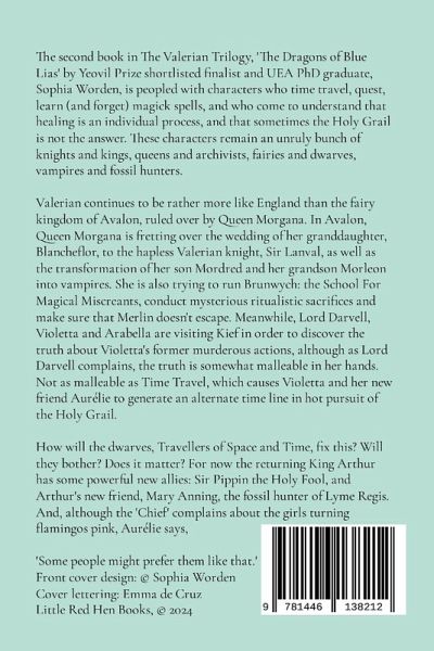 The second book in The Valerian Trilogy, 'The Dragons of Blue Lias' by Yeovil Prize shortlisted finalist and UEA PhD graduate, Sophia Worden, is peopled with characters who time travel, quest, learn (and forget) magick spells, and who come to understand that healing is an individual process, and that sometimes the Holy Grail is not the answer. These characters remain an unruly bunch of knights and kings, queens and archivists, fairies and dwarves, vampires and fossil hunters . Valerian continues to be rather more like England than the fairy kingdom of Avalon, ruled over by Queen Morgana. In Avalon, Queen Morgana is fretting over the wedding of her granddaughter, Blancheflor, to the hapless Valerian knight, Sir Lanval, as well as the transformation of her son Mordred and her grandson Morleon into vampires. She is also trying to run Brunwych: the School For Magical Miscreants, conduct mysterious ritualistic sacrifices and make sure that Merlin doesn't escape. Meanwhile, Lord Darvell, Violetta and Arabella are visiting Kief in order to discover the truth about Violetta's former murderous actions, although as Lord Darvell complains, the truth is somewhat malleable in her hands. Not as malleable as Time Travel, which causes Violetta and her new friend Aurélie to generate an alternate time line in hot pursuit of the Holy Grail.. How will the dwarves, Travellers of Space and Time, fix this? Will they bother? Does it matter? For now the returning King Arthur has some powerful new allies: Sir Pippin the Holy Fool, and Arthur's new friend, Mary Anning, the fossil hunter of Lyme Regis. And, although the 'Chief' complains about the girls turning flamingos pink, Aurélie says, 'Some people might prefer them like that.'