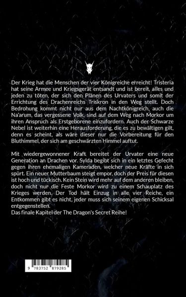 Der Krieg hat die Menschen der vier Königreiche erreicht! Tristeria hat seine Armee und Kriegsgerät entsandt und ist bereit, alles und jeden zu töten, der sich den Plänen des Urvaters und somit der Errichtung des Drachenreichs Triskron in den Weg stellt. Doch Bedrohung kommt nicht nur aus dem Nachtkönigreich, auch die Na'arum, das vergessene Volk, sind auf dem Weg nach Morkor um ihren Anspruch als Erstgeborene einzufordern. Auch der Schwarze Nebel ist weiterhin eine Herausforderung, die es zu bewältigen gilt, denn es scheint, als wäre dieser nur die Vorbereitung für den Bluthimmel, der sich am geschwärzten Himmel auftut.Mit wiedergewonnener Kraft bereitet der Urvater eine neue Generation an Drachen vor. Sylda begibt sich in ein letztes Gefecht gegen ihren ehemaligen Kameraden, welcher neue Kräfte in sich spürt. Ein neuer Mutterbaum steigt empor, doch der Preis für diesen ist hoch und tückisch. Kein Stein wird mehr auf dem anderen bleiben, doch nicht nur die Feste Morkor wird zu einem Schauplatz des Krieges werden. Der Tod hält Einzug in alle vier Reiche, ein Entkommen gibt es nicht, jeder muss sich seinem eigenen Schicksal entgegenstellen.Das finale Kapitel der The Dragon's Secret Reihe!