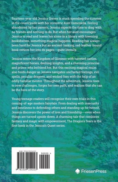 Fourteen-year-old Jessica Graves is stuck spending the summer in the countryside with her eccentric Aunt Esmeralda. Feeling abandoned by her parents, Jessica expects the time to drag with no friends and nothing to do. But when her aunt encourages Jessica to read and leaves her alone in a library with towering bookshelves, something magical happens. Reading has always been hard for Jessica but an ancient-looking, red-leather-bound book entices her into its pages-quite literally. Jessica enters the Kingdom of Glimmer with turreted castles, magnificent horses, dashing knights, and a charming princess and prince who befriend her. But this exciting magical realm also holds danger as Jessica navigates uncharted feelings, evil spells, peculiar dragons, and wicked foes with the help of an oddly familiar mentor. Throughout the adventure, Jessica rises to new challenges, forges her own path, and realizes that she can be the hero of the story. Young teenage readers will recognize their own trials in this coming-of-age modern fairytale. From dealing with insecurity and loneliness to defending others and standing up for herself, Jessica discovers the power of love and friendship-even when things are turned upside down. A charming tale that combines fantasy and magic with empowerment, The Dragon's Tears is the first book in the Jessica's Quest series.