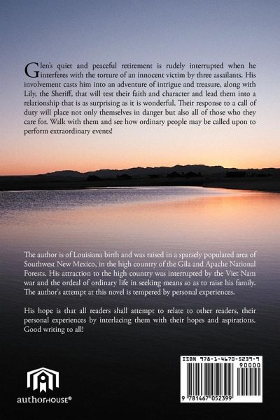 ABOUT THE BOOK Glen's quiet and peaceful retirement is rudely interrupted when he interferes with the torture of an innocent victim by three assailants. His involvement casts him into an adventure of intrigue and treasure, along with Lily, the Sheriff, that will test their faith and character and lead them into a relationship that is as surprising as it is wonderful. Their response to a call of duty will place not only themselves in danger but also all of those who they care for. Walk with them and see how ordinary people may be called upon to perform extraordinary events!