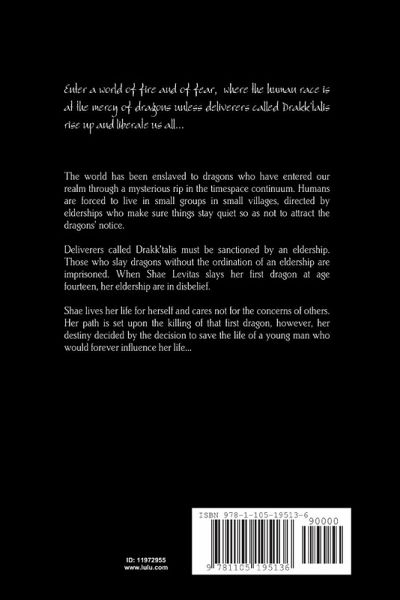 Enter a time of fire, of dragons and of fear. The world has been enslaved to dragons who have entered our realm through a mysterious rip in the universe. Humans are forced to live in small groups in villages, directed by elderships who make sure things stay quiet so as not to rouse the dragons' notice. Deliverers called Drakk'talis must be sanctioned by an eldership. Those who slay dragons without the ordination of an eldership are imprisoned. When Shae Levitas slays her first dragon at age 14, her eldership are in disbelief. Shae lives her life for herself and cares not for the concerns of others. Her path is set upon the killing of that first dragon, however, her destiny decided by the decision to save a young man who would forever influence her life...