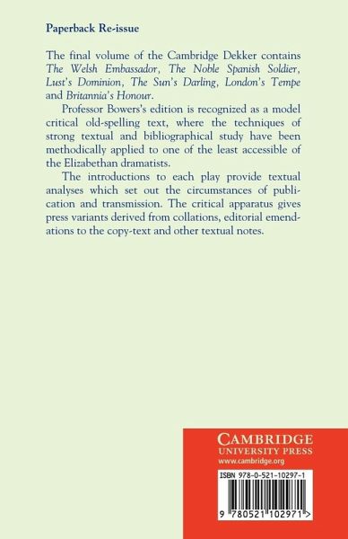 The final volume of the Cambridge Dekker contains The Welsh Ambassador, The Noble Spanish Soldier, Lust's Dominion, The Sun's Darling, London's Tempe and Britannia's Honour.