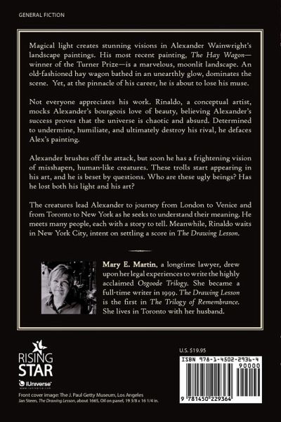 Magical light creates stunning visions in Alexander Wainwright's landscape paintings. His most recent painting, The Hay Wagon, is a marvelous, moonlit scene, with an old-fashioned hay wagon dominating the foreground, with a beautiful, unearthly glow. Yet, at the pinnacle of his career, he is about to lose his muse. Not everyone appreciates his work. Rinaldo, a conceptual artist, mocks Alexander's bourgeois love of beauty, believing Alexander's success proves that the universe is chaotic and absurd. Determined to undermine, humiliate and ultimately destroy his rival, he defaces Alex's painting. Alexander brushes off the attack, but soon he has a frightening vision of misshapen, human-like creatures. These trolls start appearing in his art, and he is beset by questions. Who are these ugly beings? Has he lost both his light and his art? The creatures lead Alexander to journey from London to Venice and from Toronto to New York as he seeks to understand their meaning. He meets many people, each with a story to tell. Meanwhile, Rinaldo waits in New York City, intent on settling a score in The Drawing Lesson.